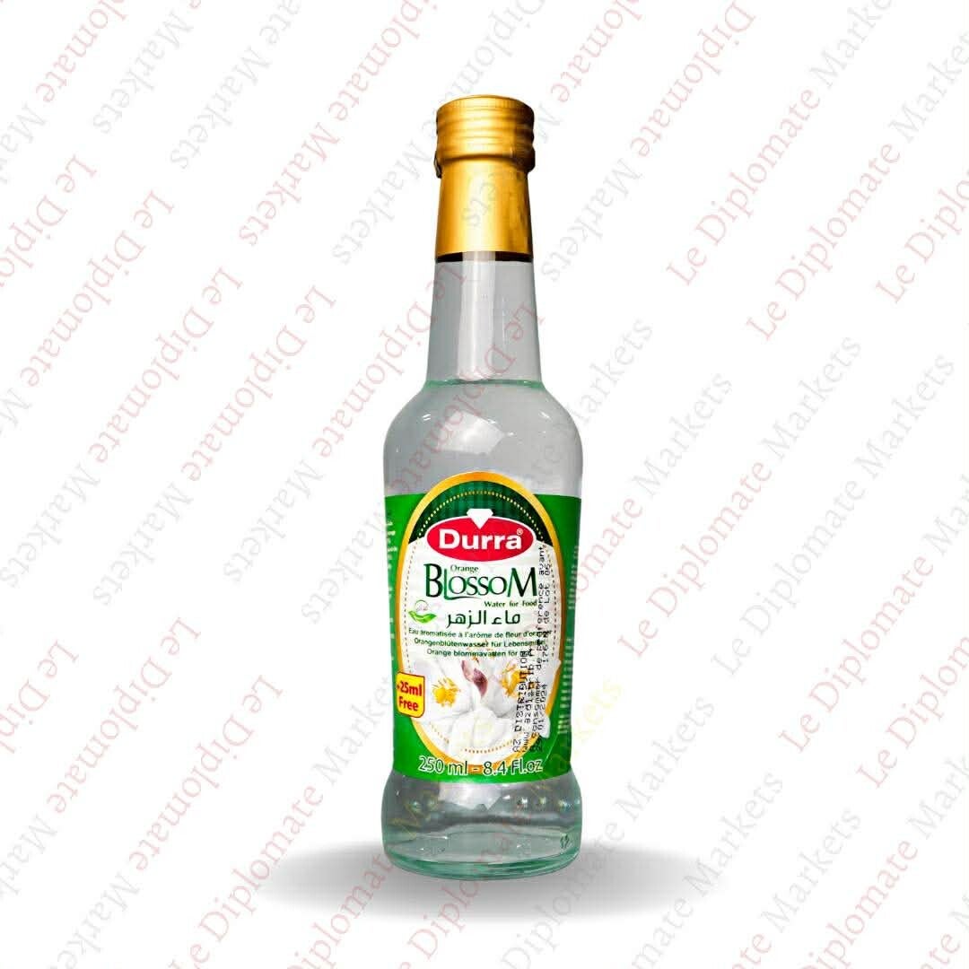 Aromatic orange blossom water from Durra, made from natural citrus blossoms. It offers a delicate floral flavor and fragrance, widely used in Middle Eastern desserts and drinks.